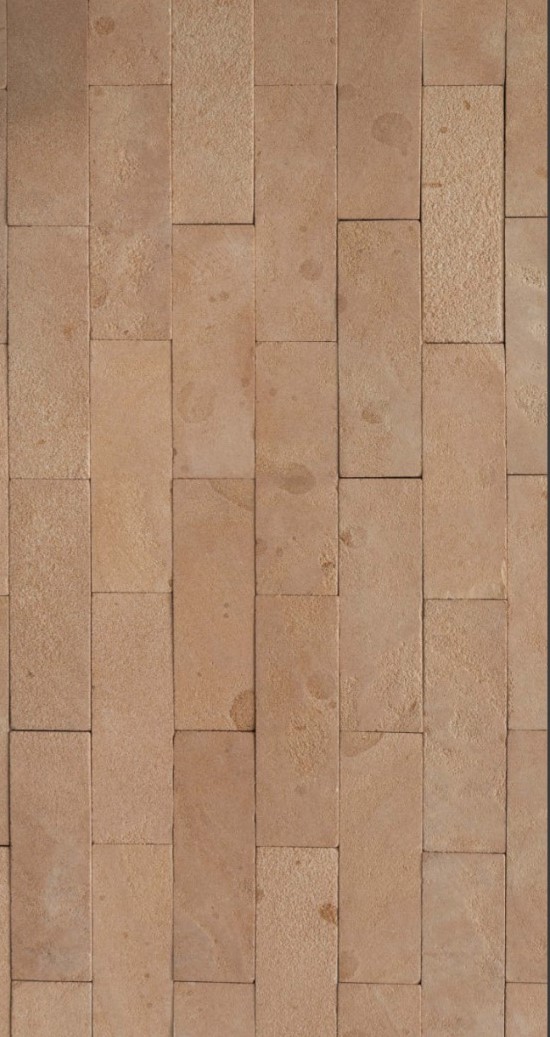 Revestimento em pedra natural feito de peças serradas unitárias de 7,5 x 23 cm (formato tijolinho - brick).